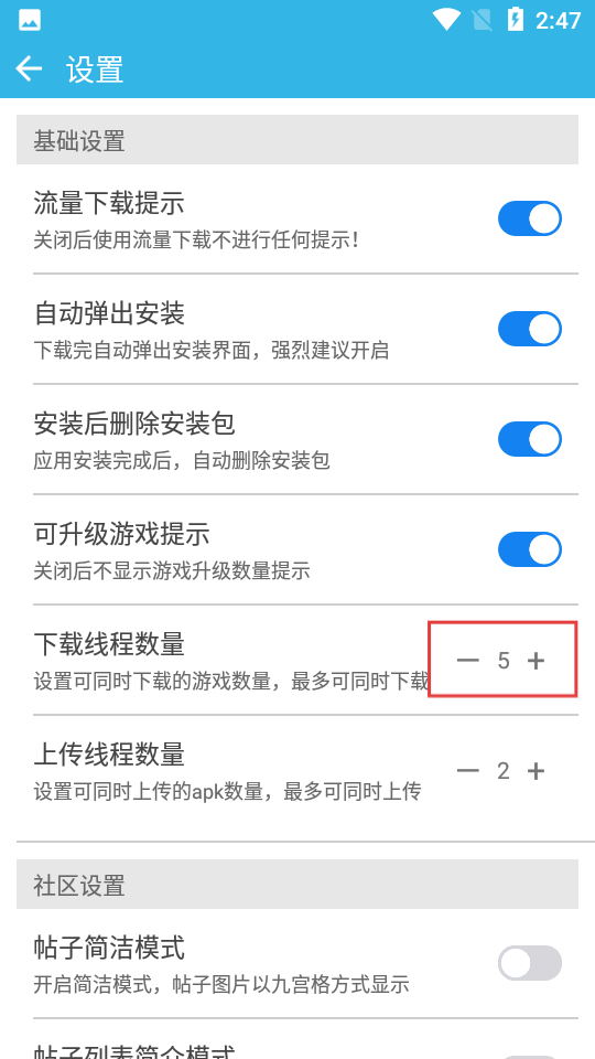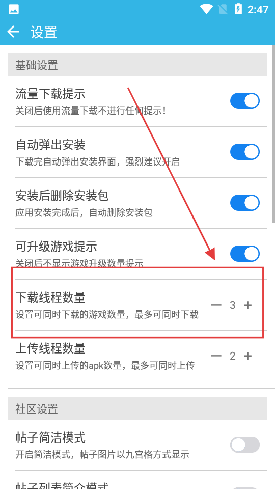 3、在设置界面找到【下载线程数量】,可调整同时下载游戏的数量,提升下载效率哦。