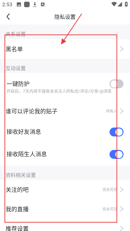 4、在隐私设置里,能看到【黑名单】【一键防护】等诸多选项,大家可以根据自己的需求来设置哦。