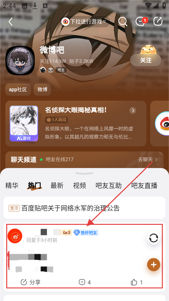 1、在贴吧“微博吧”页面,找到想要发私信的吧友的帖子,点击进入帖子详情页面吧。