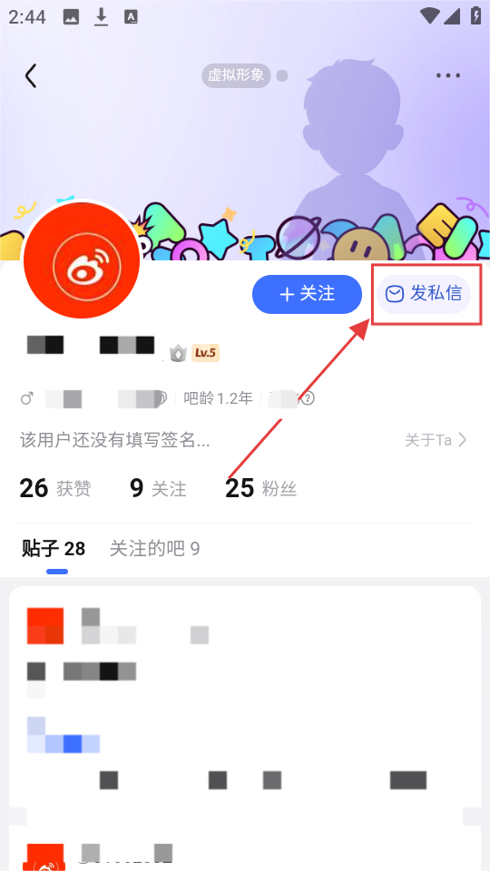 3、进入吧友个人主页后,找到【发私信】按钮点击,就能进入私信聊天界面啦。