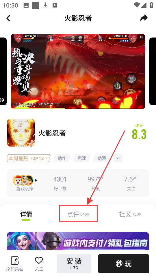 2、进入《火影忍者》详情页后,点击【点评5469】,就能看到玩家们的点评内容哦。