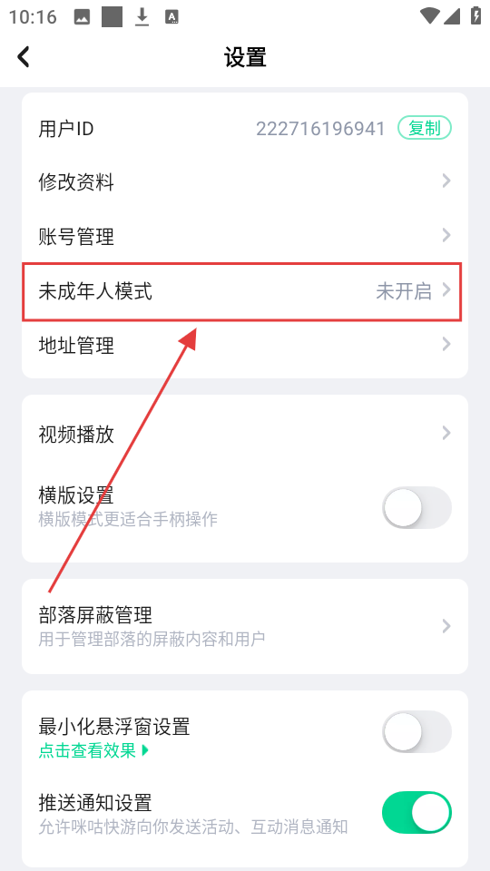 2、进入设置后,点击【未成年人模式】,就能进入未成年人模式的设置页面啦。