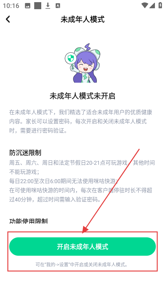 3、在未成年人模式页面点击【开启未成年人模式】,就能进入密码设置环节哦。