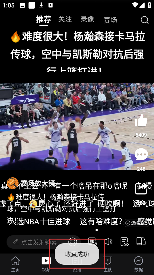 4、在收藏页面,可看到已收藏的视频【难度很大!杨瀚森接卡马拉传球...】,随时可点击查看哦。