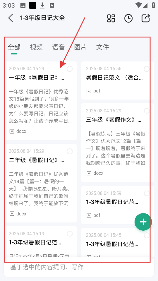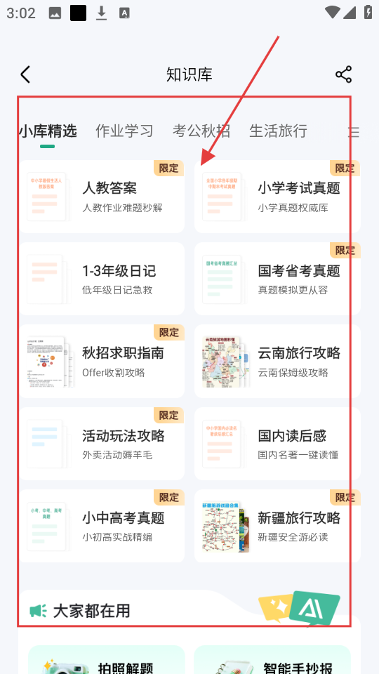 2、进入知识库页面,有【人教答案】等多种资料分类,选你需要的资料分类,比如【1-3年级日记】。