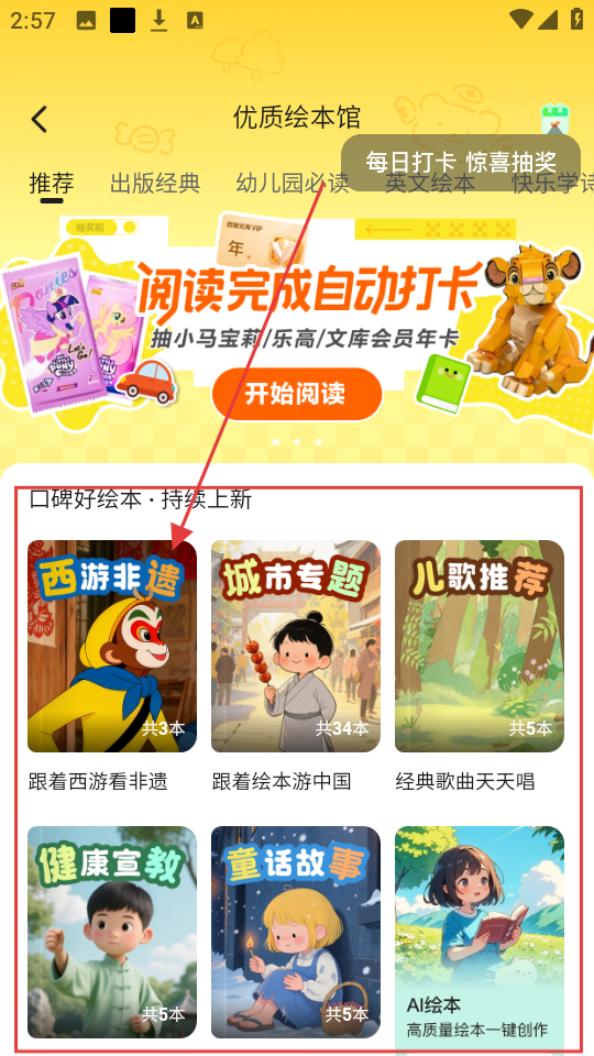 2、在优质绘本馆页面,若想选择感兴趣的绘本分类,比如“西游非遗”,点击该分类,就能进入相关绘本内容页面哦。