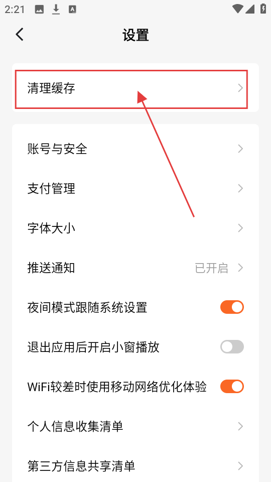 2、进入设置界面后,找到【清理缓存】选项并点击,就能进入清理缓存页面,为释放空间做准备哟。
