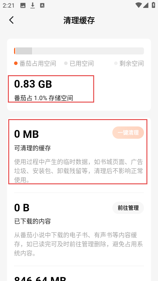 4、清理完成后,能看到番茄占用空间和可清理缓存都有变化,这样就成功释放出更多存储空间啦。