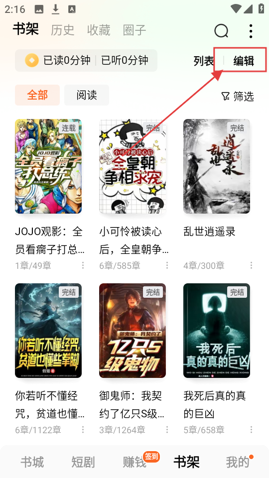 1、在书架界面,点击右上角【编辑】按钮,就能进入书籍编辑状态,方便对书架里的小说进行管理啦。