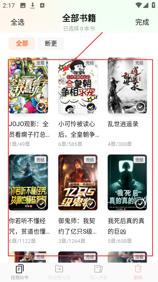 2、进入编辑状态后,可选择要操作的小说,选好后就能进行后续操作哟。