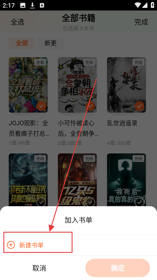 3、选好小说后,点击【新建书单】,就能把选中的小说归类到新书单里,让书架更整洁,找小说也更方便呢。