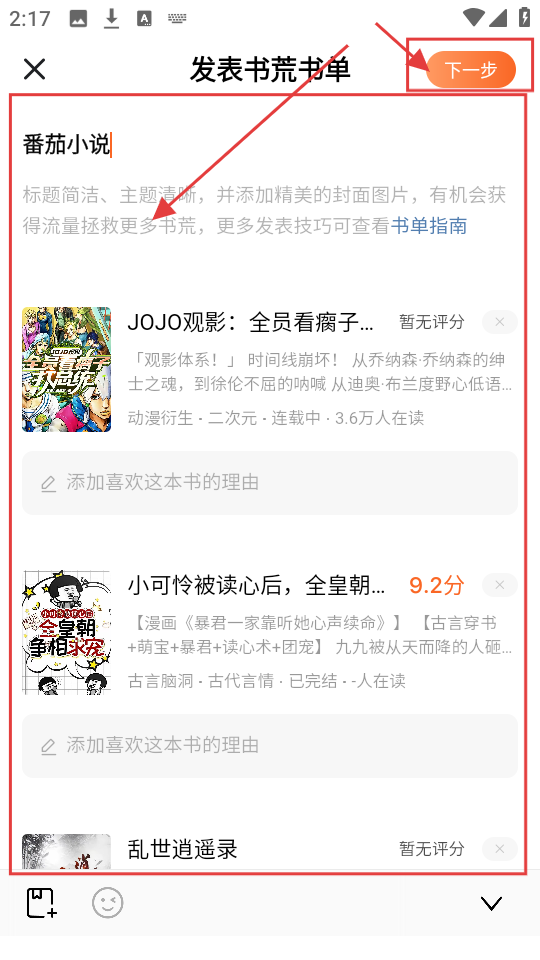 4、在发表书荒书单页面,添加好小说,再点击【下一步】,就能继续发布流程啦。