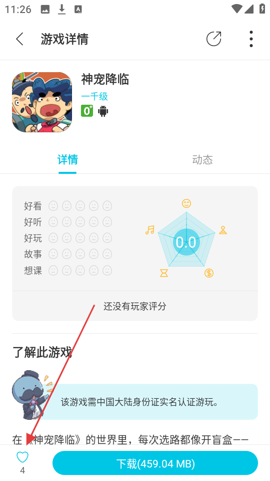 2、进入《神宠降临》详情页后,点击左下角的心形图标,就能关注这款游戏啦。