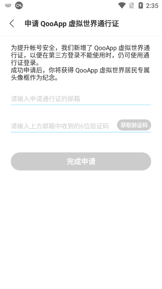 2、如果是点击游客登录的话,会跳转到这个页面,可以点击左上角的按钮,可以返回到主页面;也可以申请qooapp虚拟世界通行证,直接填写下方对应的信息即可;