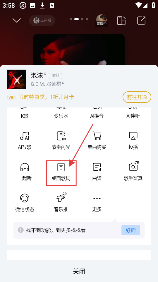 3、在展开的选项中,找到【桌面歌词】并点击,准备开启桌面歌词功能哦。