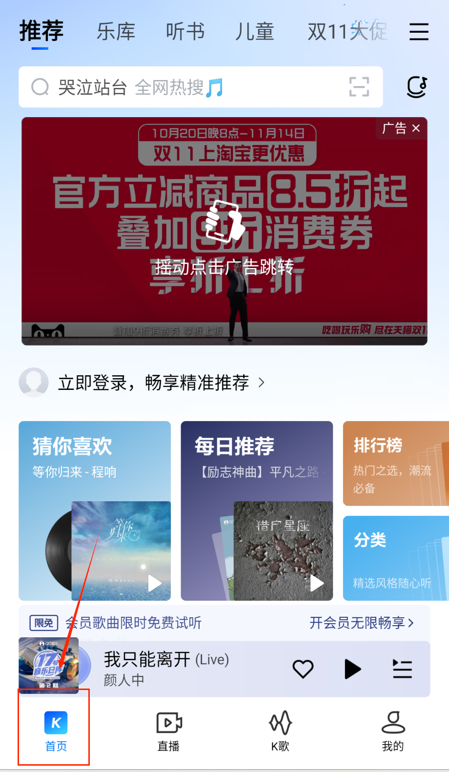 1、登录后首页会显示个性化内容,顶部有推荐、乐库、听书等分类标签,可以根据心情切换不同频道,比如想放松时可以点进“听书”区域呀。