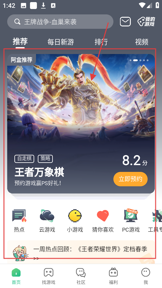1、在软件首页,有阿盒推荐的游戏如【王者万象棋】,点击它可进入游戏详情页,了解游戏信息哦。