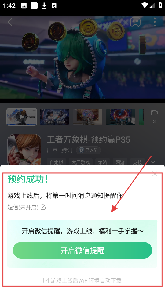 4、预约成功后,会弹出提示,可点击【开启微信提醒】,以便及时获取游戏上线和福利信息啦。