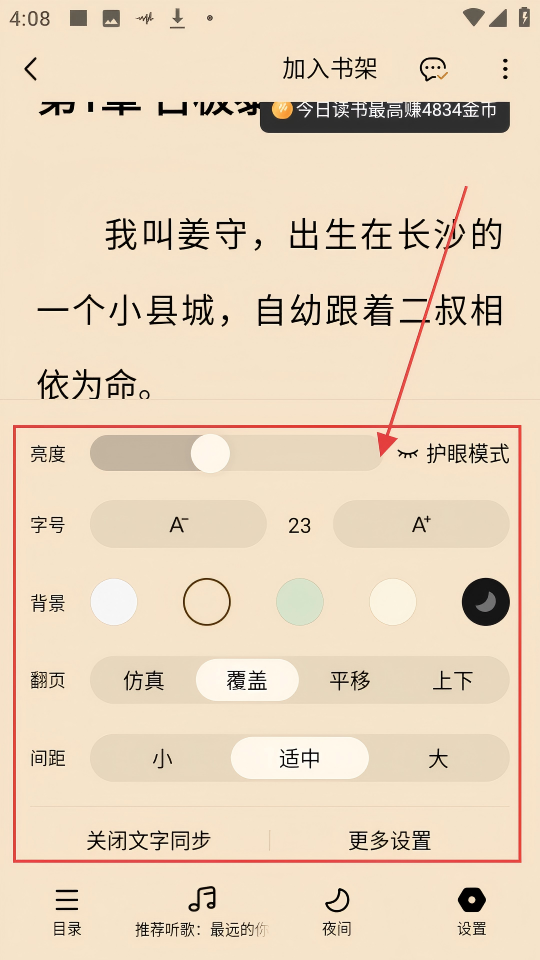 4、在阅读设置里,可调节亮度、字号,更换背景,选择翻页方式等,设置好后就能舒适阅读啦。