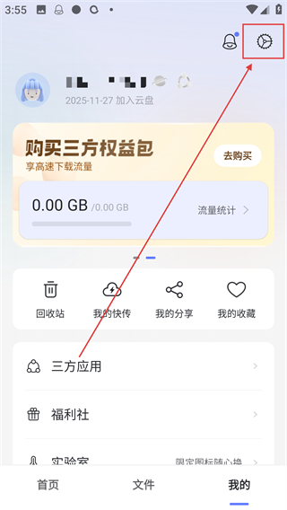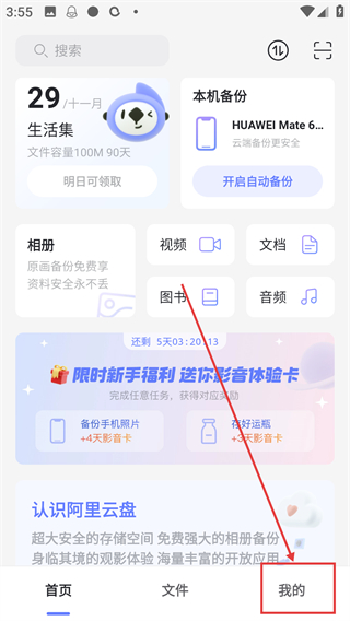 1、在阿里云盘首页,点击底部的【我的】选项,就能进入个人中心页面查看各类功能啦。