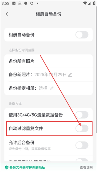 4、在备份配置页,可开启【自动过滤重复文件】功能,这样备份时就能避免重复文件占用空间啦。