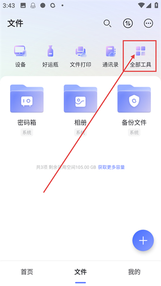 1、在文件页面,点击右上角的【全部工具】选项,就能打开所有功能应用的列表页面啦。