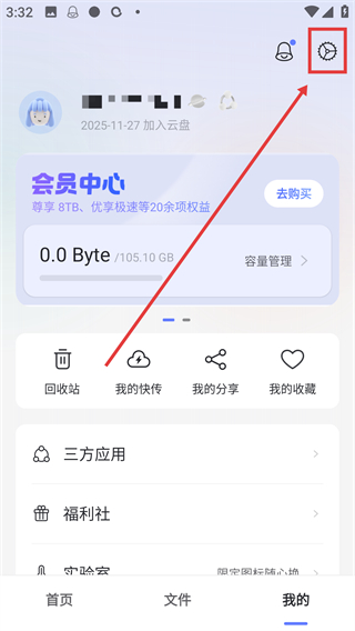 1、在阿里云盘的“我的”页面,点右上角【设置】按钮能进入设置界面,后续可配置账号相关选项啦。