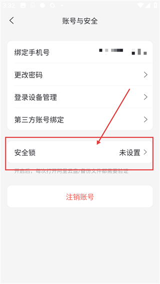 3、在账号与安全页,点【安全锁】选项(显示“未设置”),能进入安全锁设置页面,准备配置安全验证啦。