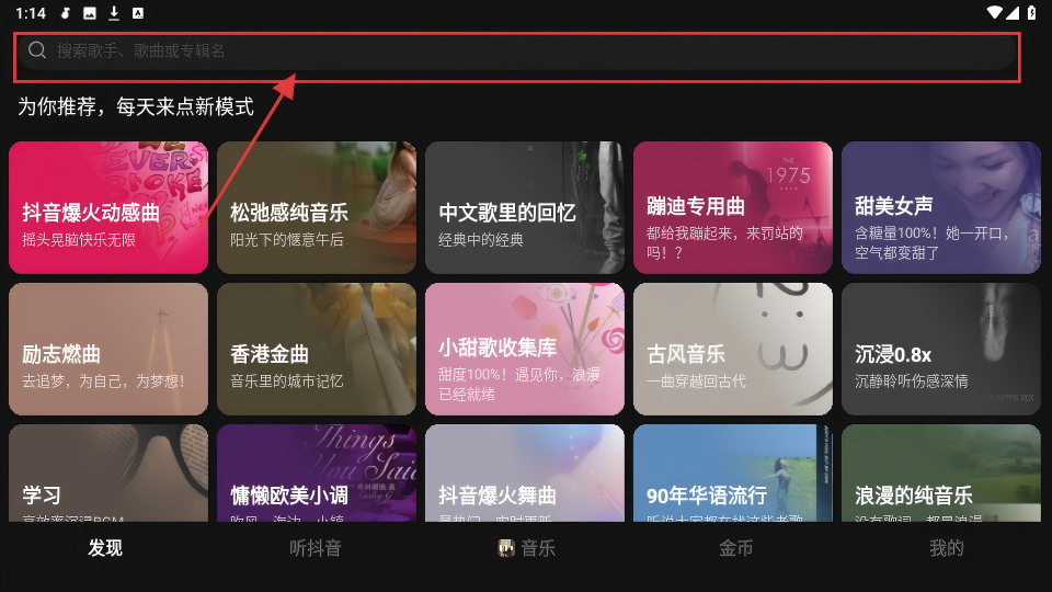 2、在发现页顶部,有搜索框,可输入歌手、歌曲或专辑名,快速查找想听的音乐,超方便的。