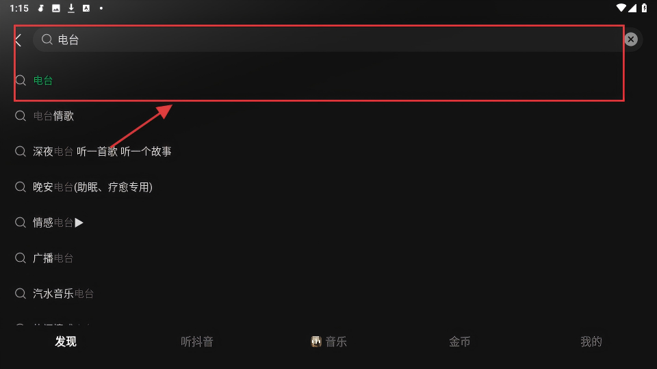 3、在搜索框输入【电台】,会出现相关搜索建议,选【电台】,能进入电台页面,发现各类电台哦。