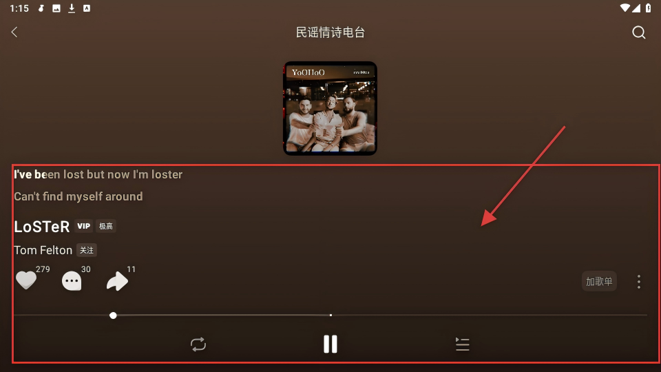 4、进入电台播放页面,像【民谣情诗电台】,能听到好听的歌曲,还可点赞、分享,超赞的。