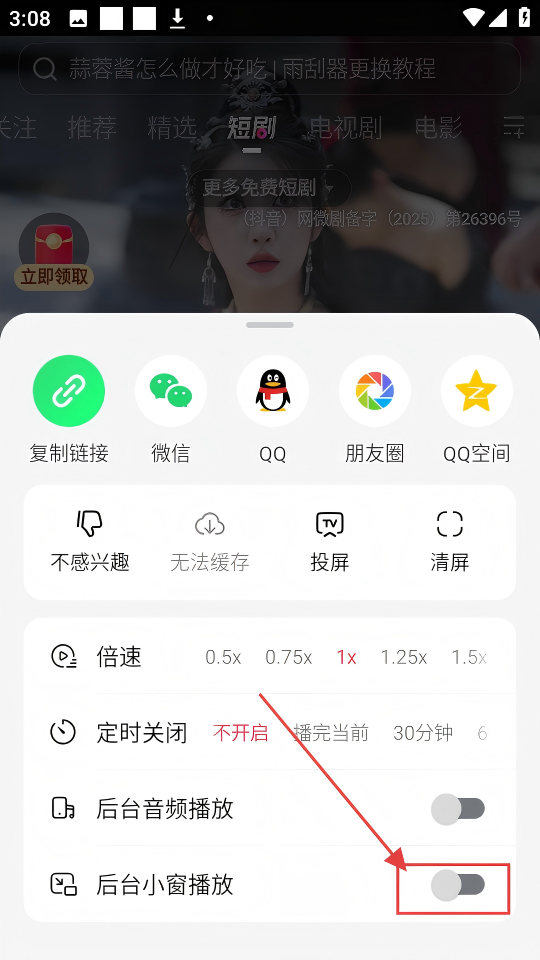 3、在设置菜单里,找到【后台小窗播放】选项,点击它旁边的开关,就能开启小窗播放功能。
