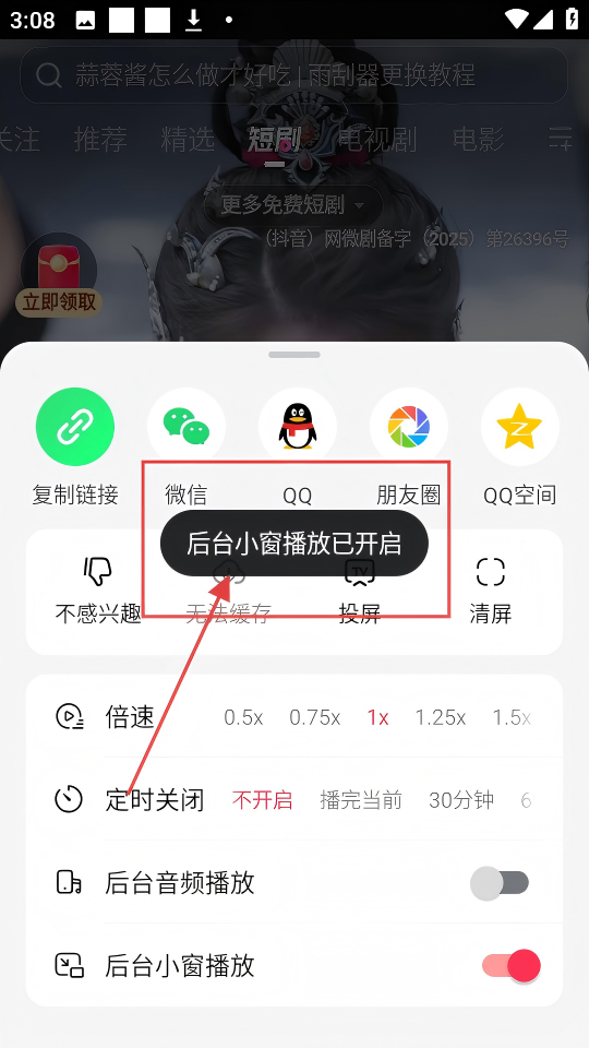 4、开启后,会看到【后台小窗播放已开启】的提示,这样就能用小窗播放视频啦,超棒的。