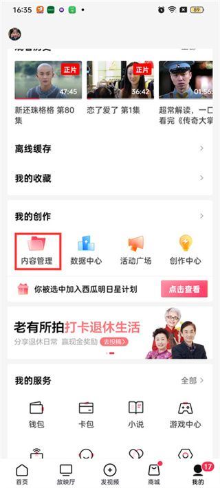 2、在我的页面中可以查看观看历史、离线缓存、我的收藏等内容,我们在该页面中需要点击【内容管理】。