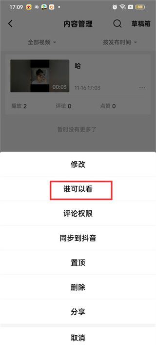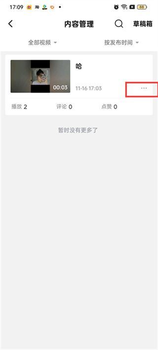 3、在内容管理页面中,我们可以查看到已经发布过的视频,选择要设置公开可见的视频,在这里我们选择要设置公开可见的视频,点击视频右下角的【三点图标】。