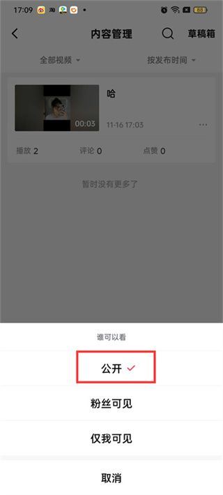 5、最后我们点击谁可以看到之后会有三个选项公开、粉丝可见和仅我可见,我们点击【公开】即可;