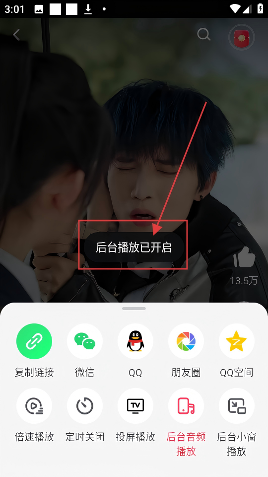 4、开启后,会看到【后台播放已开启】的提示,这样就能在后台听视频音频啦。