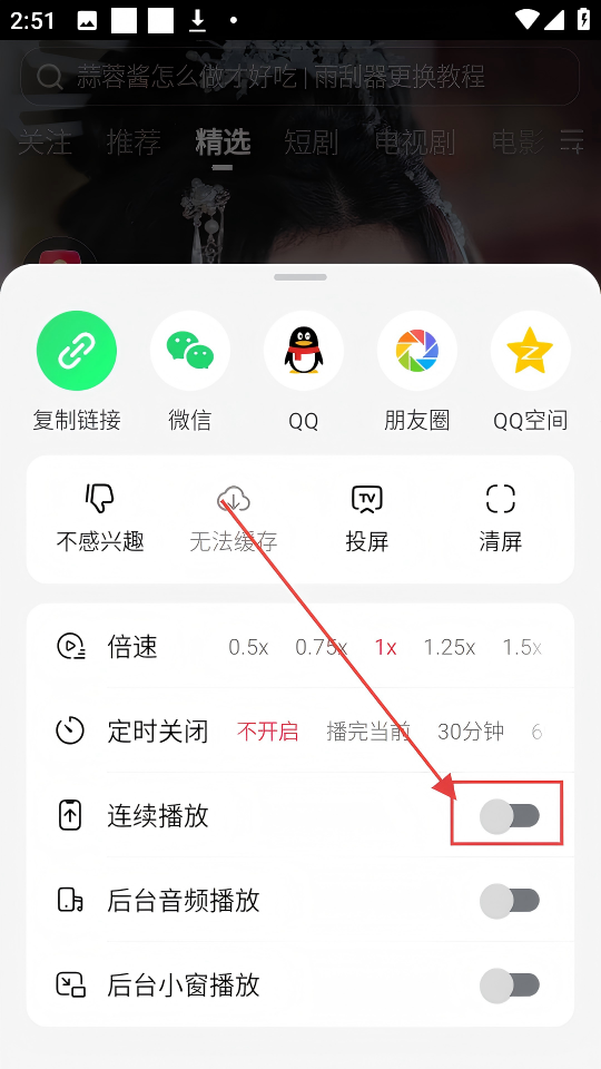 2、在设置菜单里,找到【连续播放】选项,点击它旁边的开关,就能开启连续播放功能啦。