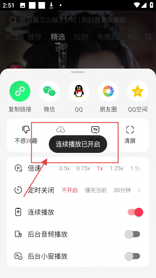 3、开启后,会看到【连续播放已开启】的提示,这样视频就能自动连续播放,不用手动啦。
