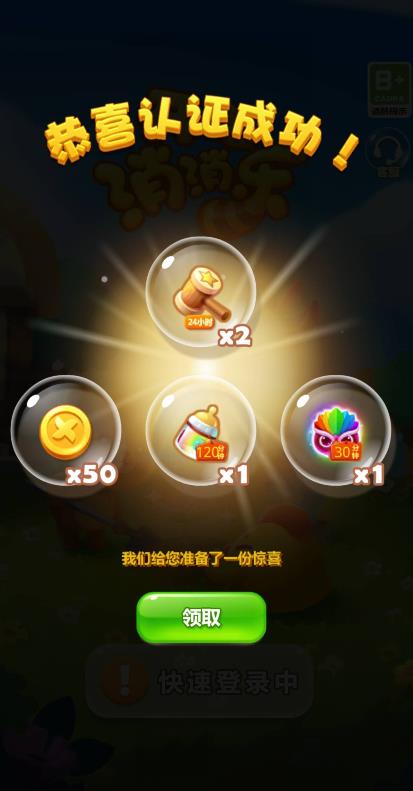 4、认证成功之后会发放游戏奖励,点击领取。