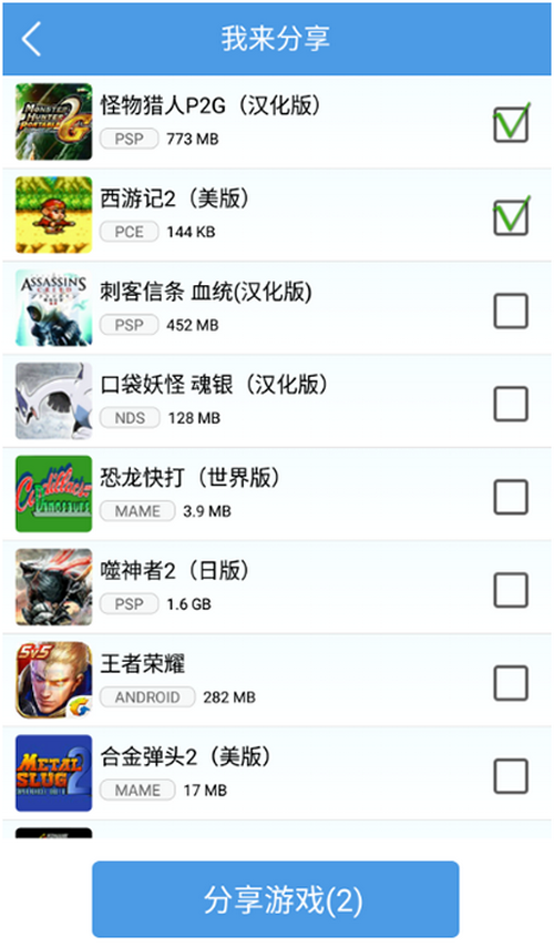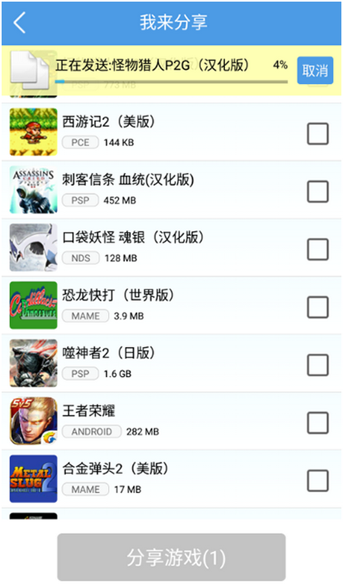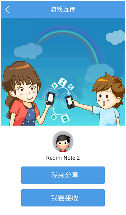 2、在【游戏互传】中,分为分享方与接收方。分享方需要点击我来分享,就可以看到你的游戏列表,在列表中点击你想分享的游戏,最后点【分享游戏】就可以了。