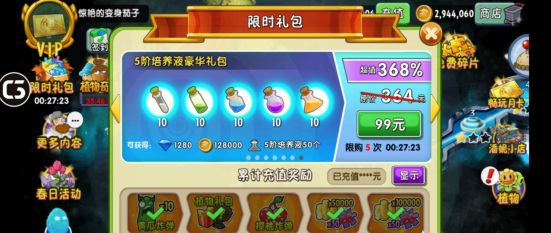 4.购买培养液豪华礼包后,你将得到五十瓶营养液,五十瓶营养液看起来很多,然而实际上升一个橙色五阶植物就要使用掉十瓶橙色培养液,非常的费营养液,这么一算下来,一个礼包也只能升四株植物。