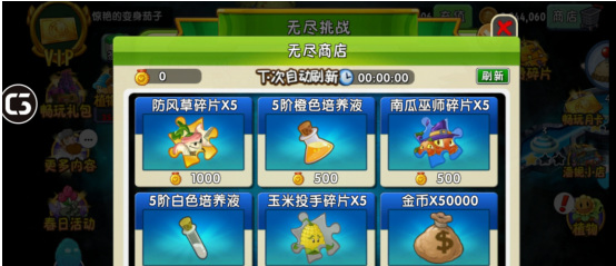 5.除了礼包购买,还可以通过无尽挑战中获得勋章,然后在无尽商店兑换营养液,无尽商店每隔一段时间就会刷新,每次刷新都会有不同的植物碎片和营养液,买不起礼包都小伙伴们就从这里兑换营养液吧,慢慢攒也是能养出一株五阶植物的。