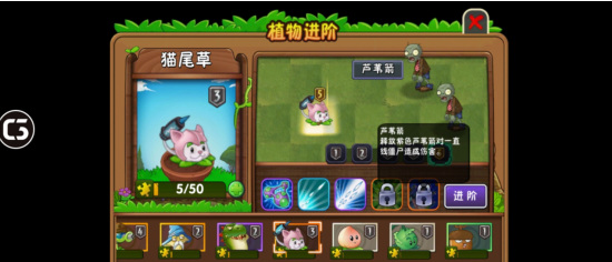 6.植物升阶后会开启一个技能,或是被动或是主动,我们图中的猫尾草升至五阶后将会有一个主动技能,释放紫色芦苇对一直线僵尸造成伤害,不同的植物进阶后的技能都不一样,建议大家根据自己的需求对植物进行升阶。