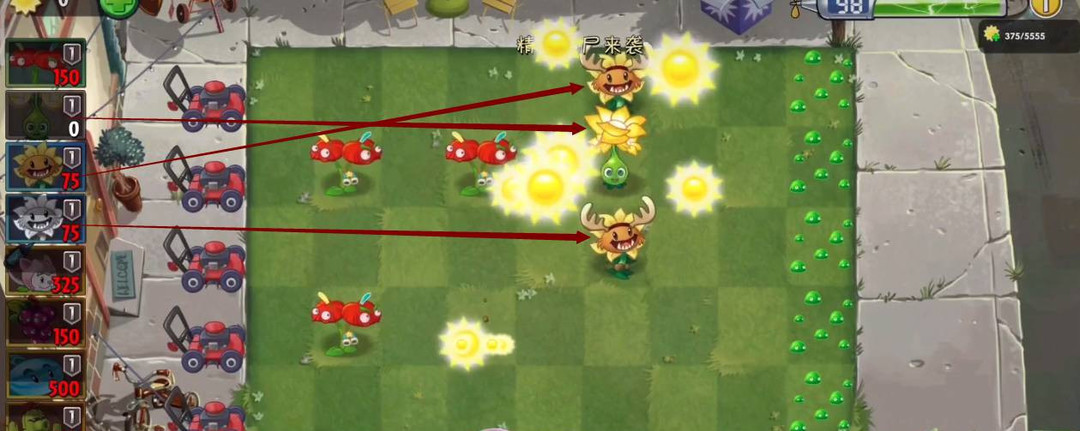 开局先种上向日葵和黄金蓓蕾,产生足够种植其他植物的阳光