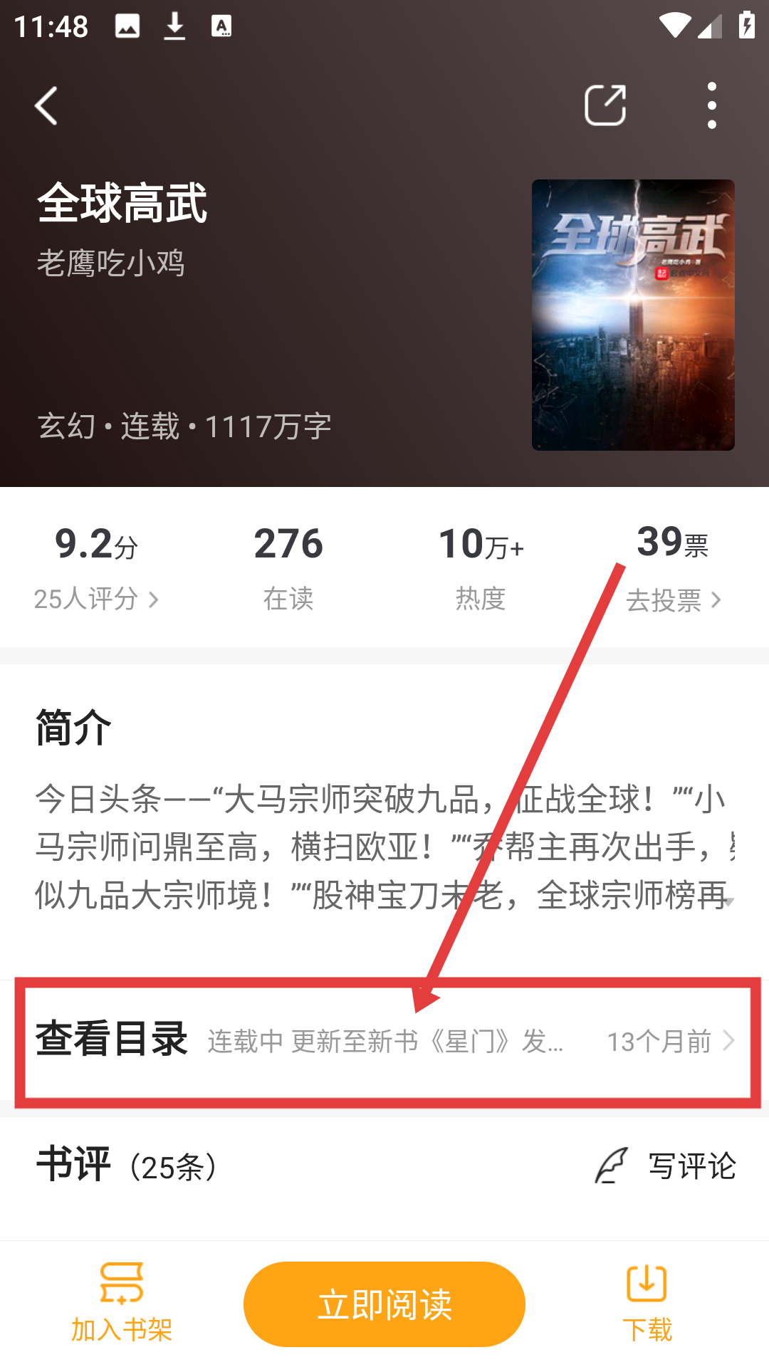 1、在书城选感兴趣的小说,像【全球高武】,点击进入小说详情界面哦。