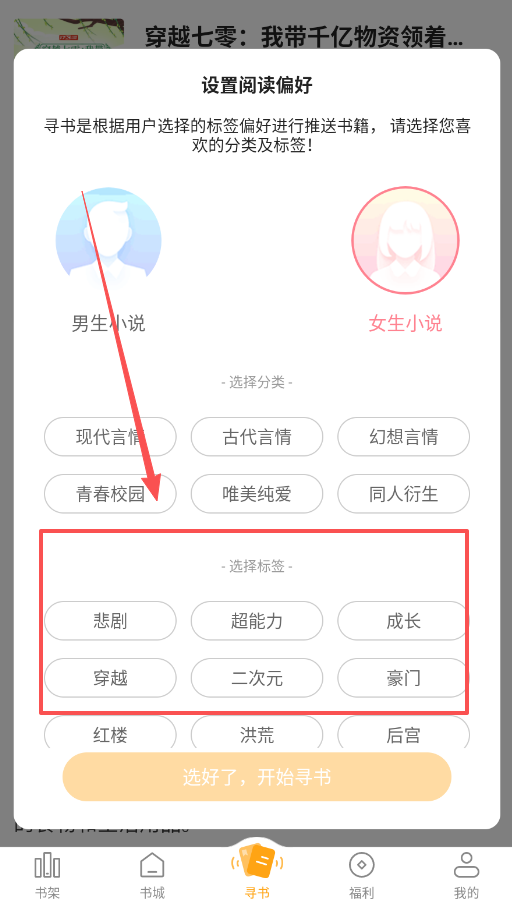2、实际操作找书时,不必完全受限于预设偏好。你可以随时进入寻书页面,根据当下心情重新选择分类和标签进行探索。