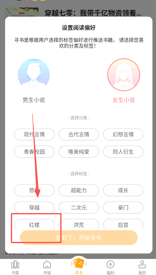 2、寻书时推送结果太少怎么办。这可能是因为你选的标签组合太小众,比如“红楼”加“超能力”。