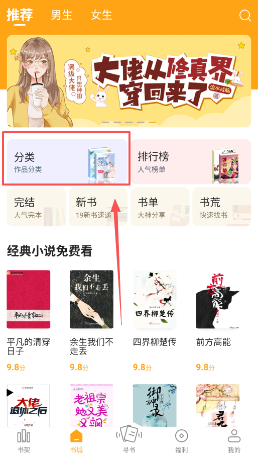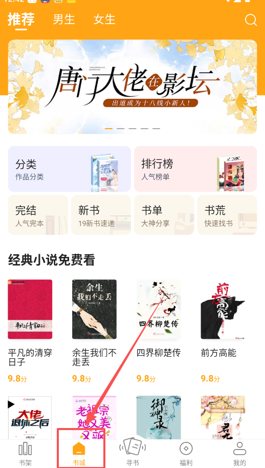 4、如果书架空空荡荡,别着急。除了寻书,你也可以去“书城”逛逛热门作品,或者看看“福利”板块有没有限免好书。