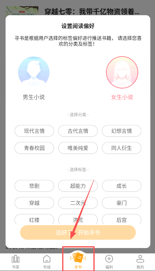 2、设置偏好时,先选择你是爱看男生小说还是女生小说,然后从分类里挑一个你最喜欢的类型,比如现代言情或者古代言情。